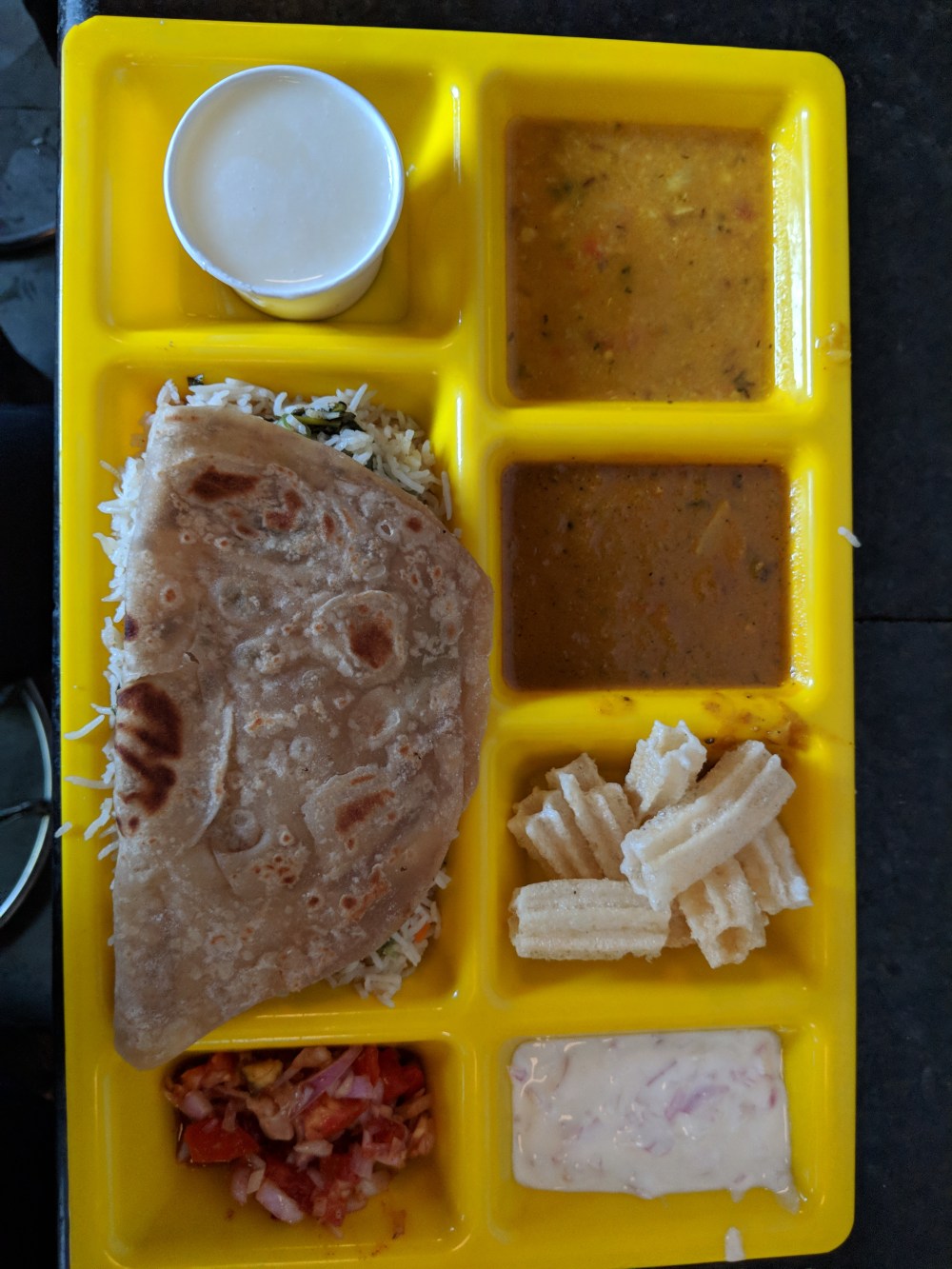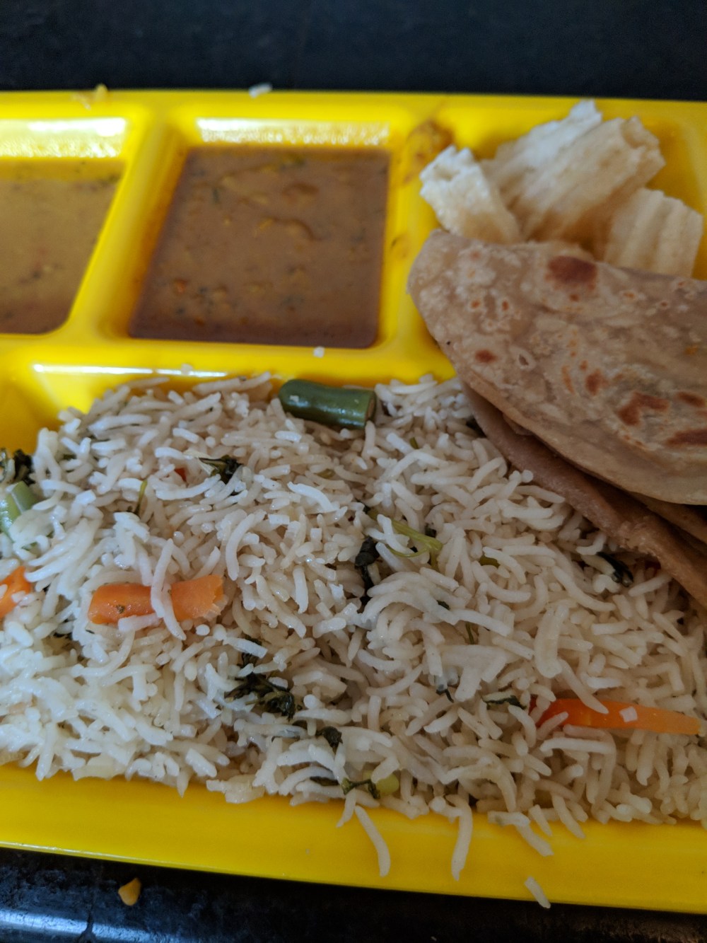 Phew .. that’s a big menu and for 80/- you will get to know that it is totally justified. The gravy had some mushrooms but I filtered it out and just had the remaining masala for the chapathi and Pulao. The Dhall was never my cup of tea even though my mom made it many times. I disliked it, but this looked okayish. It went will with the chapathi and the papad.