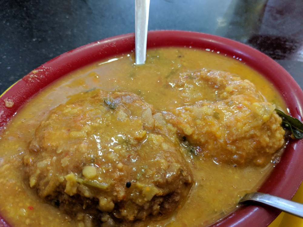 Nice, big, round Vadais that is injected to its last micrometre with sambhar and also dumped in the Sambhar and served red hot! I had to wait for 10 minutes to eat small pieces of this dish after an initial fight between the throat and the tongue for one spoon of this red hot thingy. Once I finished 1 Vadai of the 2, the server came in with an extra cup of Sambhar for the 2nd one! Kanla jalam moment combined with ena thavam seithanai. You no longer need to hesitate for asking extra sambhar and chutney. Worth it and must try!