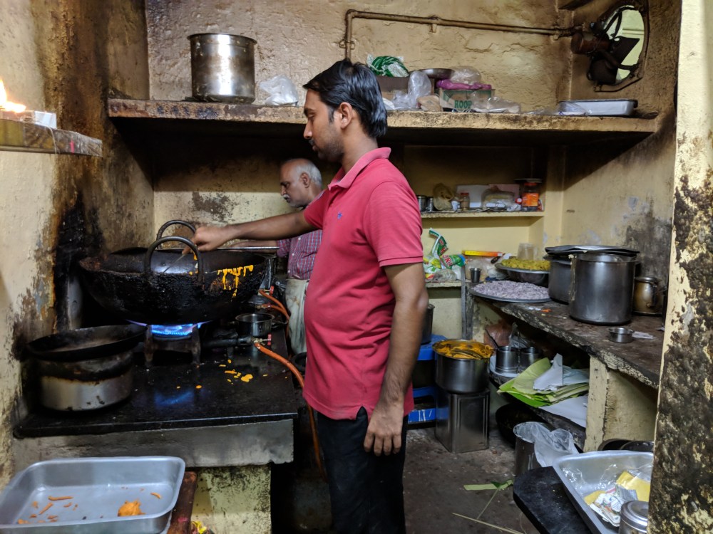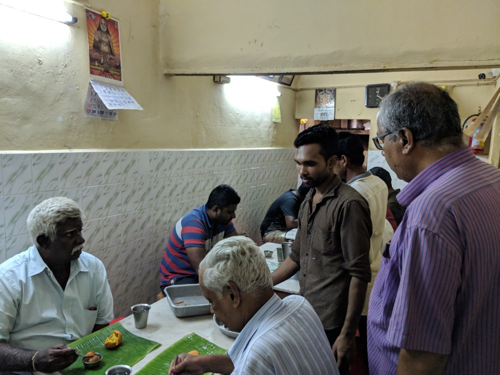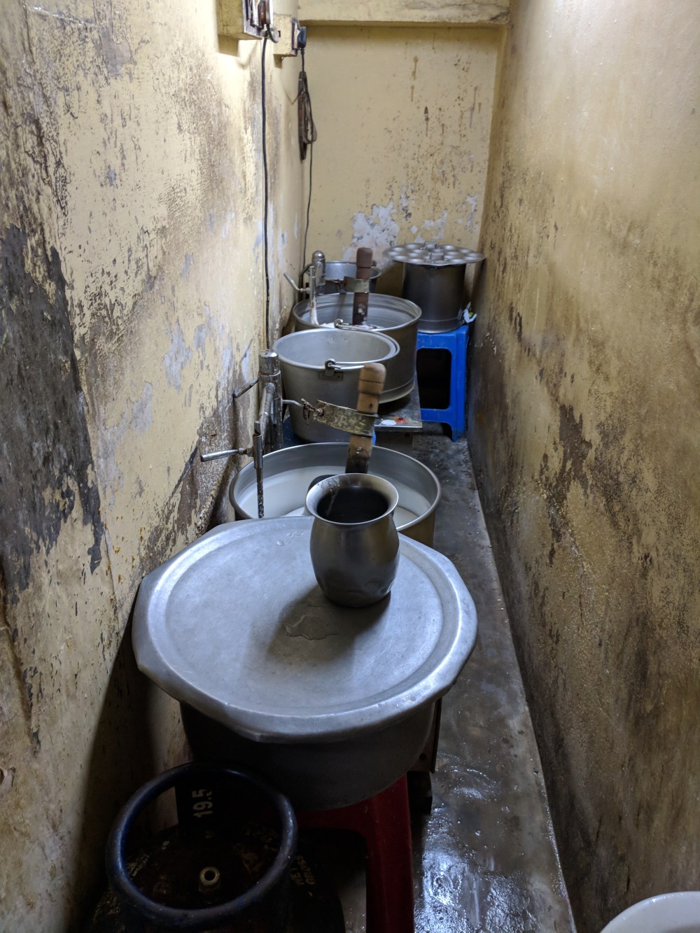 This is how it looks in the inside. At the far end you have the grinder that gives the idly, dosa and vada batter. The wash area is right before the batter area. That old man is trying to enter the dining area and get a seat.