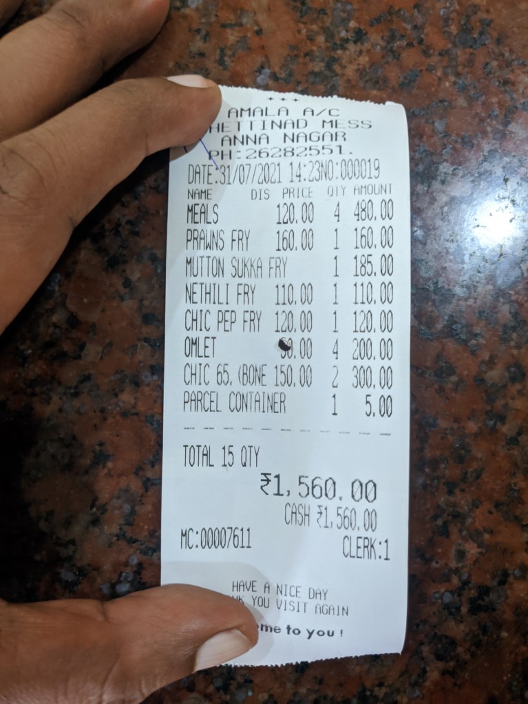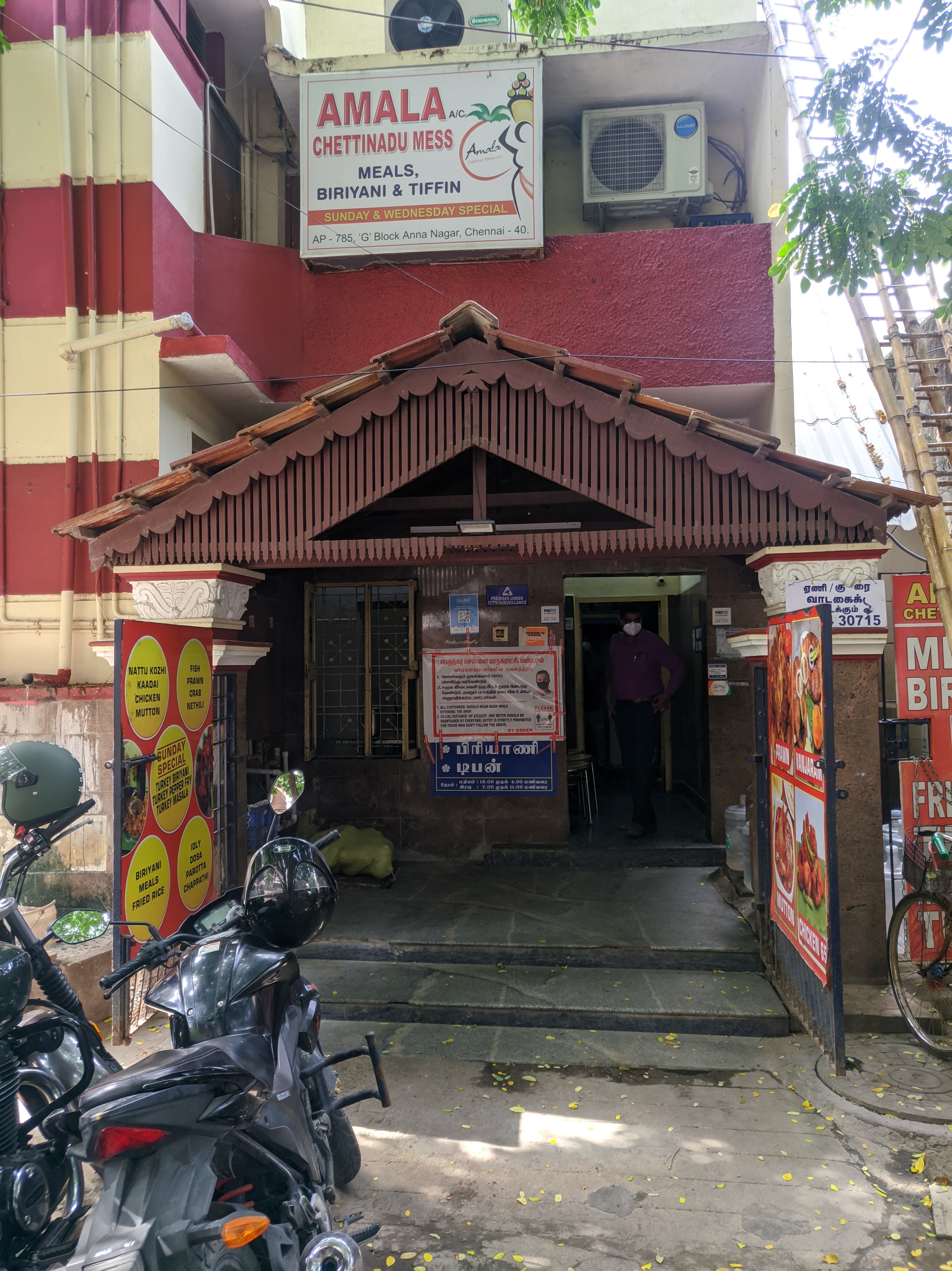 Amala chettinadu mess, located in the G block of Anna Nagar is famous for their authentic Chettinadu flavored meals, sides and biryani. On a boring Saturday afternoon when friends from college decided to catch up, we thought we would take our lunch there. It looks like a house from the outside and so many people might miss the outlet if not for their banners outside. They have a Non – A/C dining area in the ground floor and an Air-conditioned dining area upstairs.