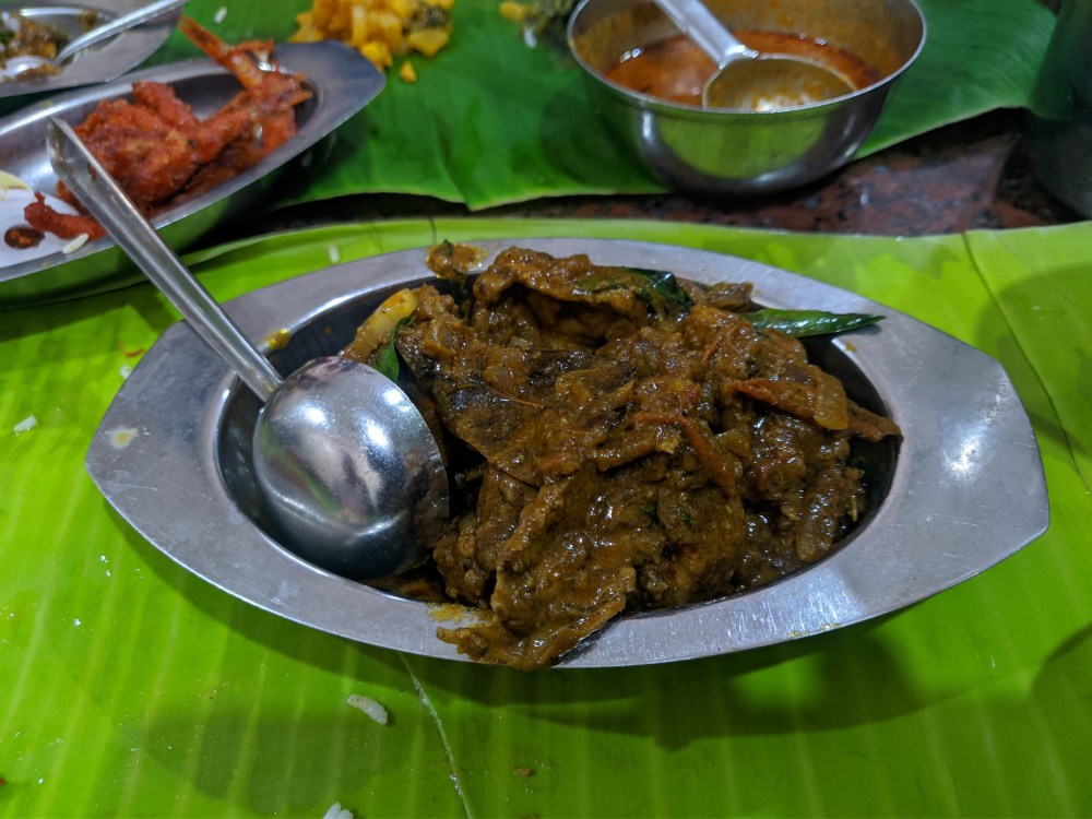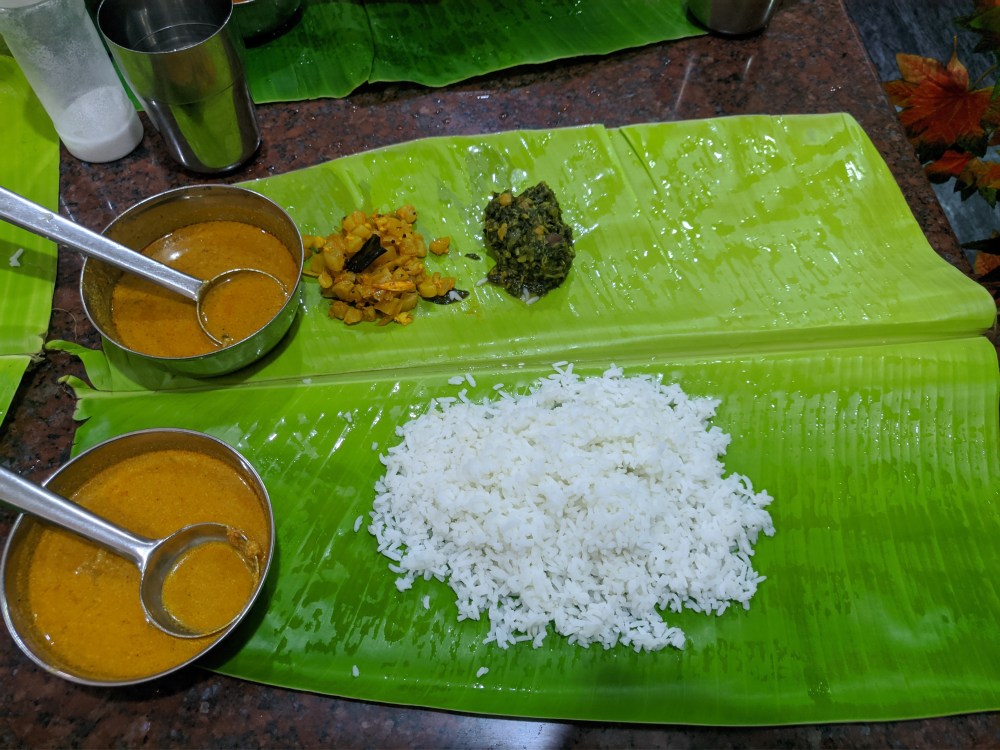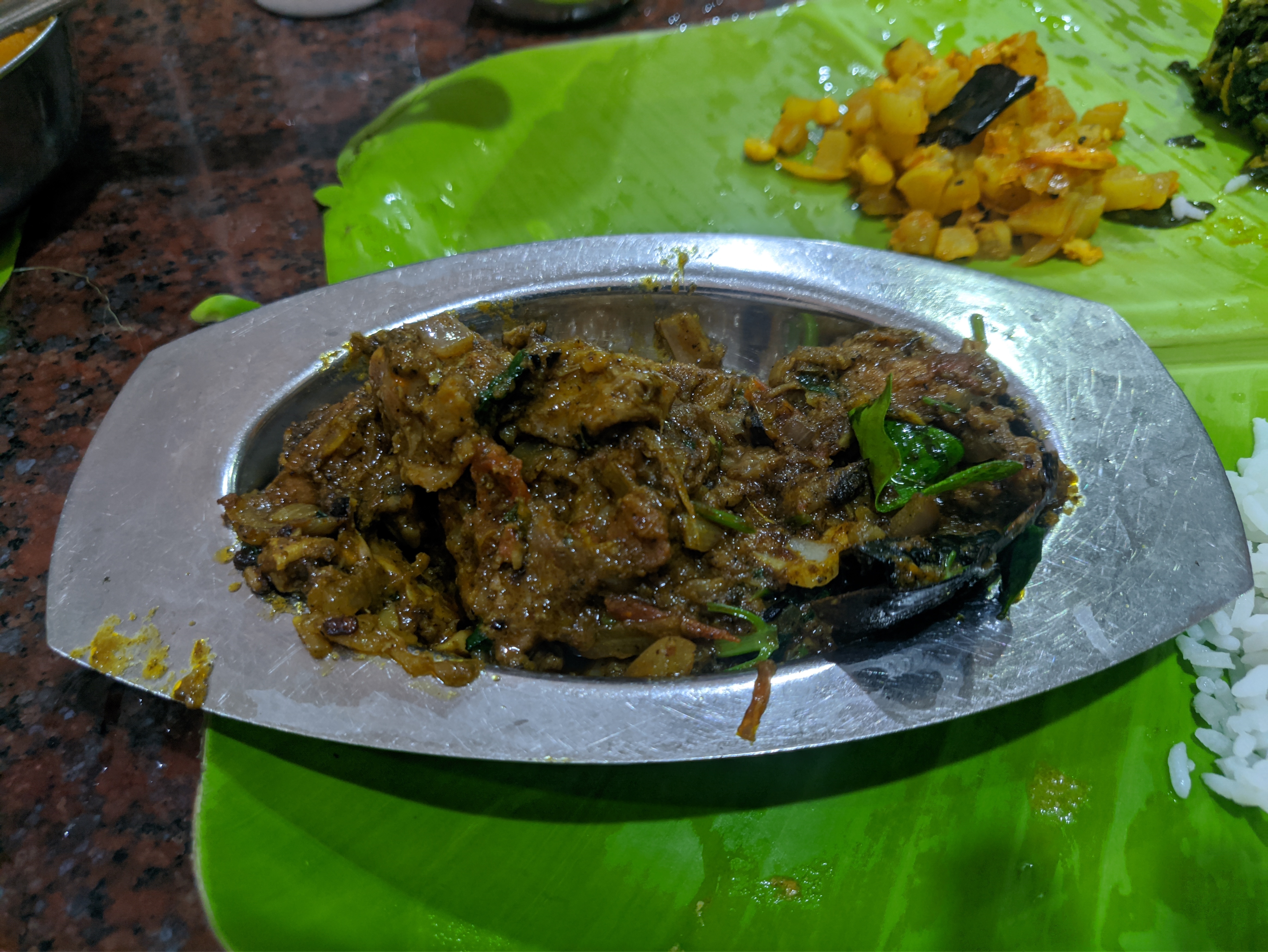 They gave us the three usual Chicken, Mutton and Fish Kuzambhu for the meals. The meals also came with Potato Poriyal and a mix of dal + spinach as sides , Rasam and Curd. We had to wait for five more minutes before we had our hands on the food.